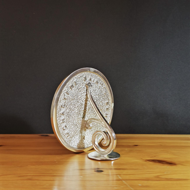 Ce baiser de paix, utilisé pendant la messe pour transmettre la Paix du prêtre au Chœur, est une œuvre d'art, arborant l'emblème du monastère. Coulé en bronze et plaqué argent, cette pièce unique de 14,5cm de diamètre est complétée par un sac en velours et une boite de protection.